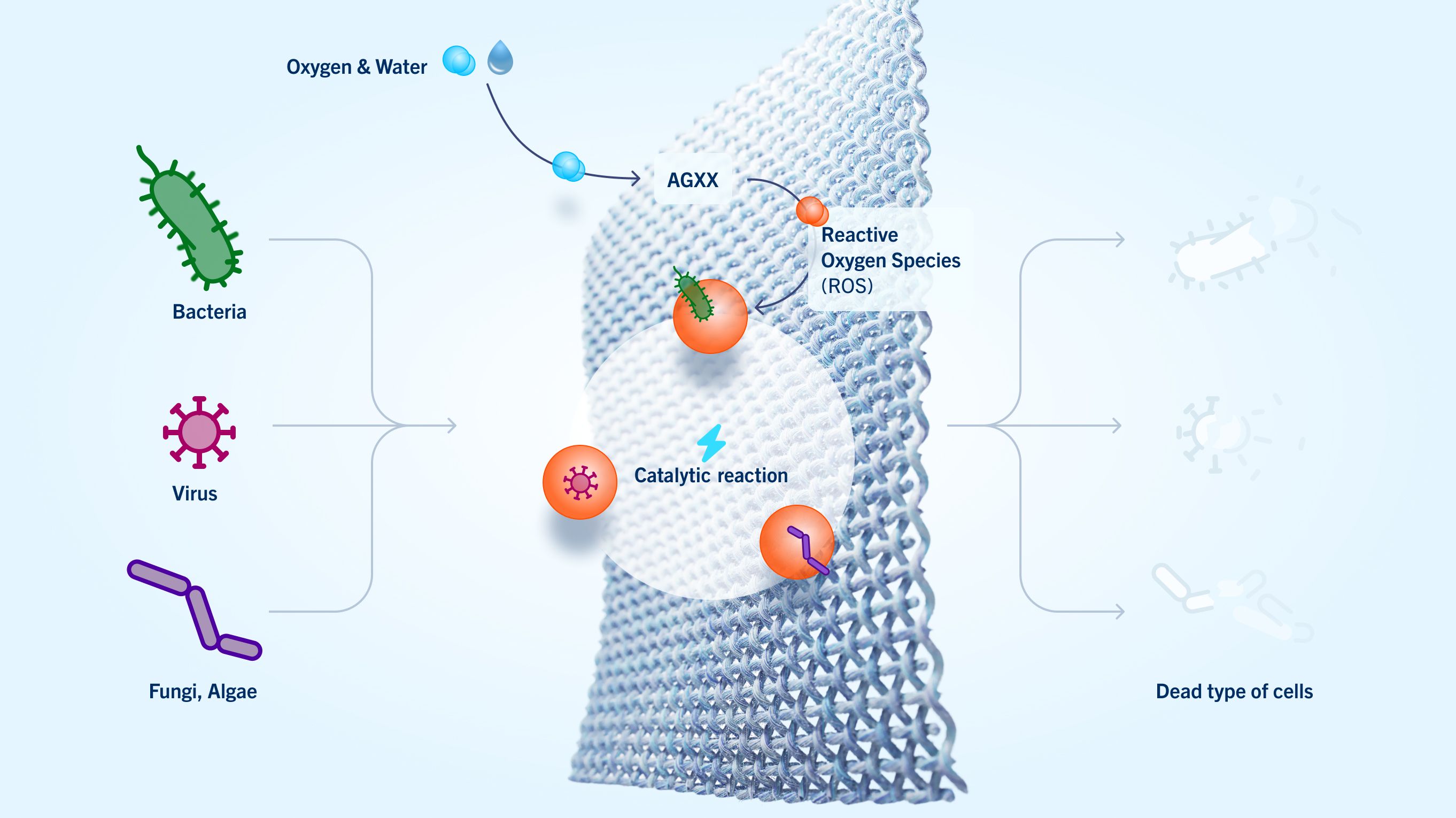 This is made possible by the novel mechanism of action: AGXX is a highly efficient catalytic technology that utilizes the interaction of two precious metals and is based on redox reactions and micro electric field effects. In this process, the oxygen present in combination with water from atmospheric moisture is converted into oxygen radicals (ROS: reactive oxygen species). These in turn react with the microorganisms and reliably kill them. At the same time, this prevents the formation of biofilms.