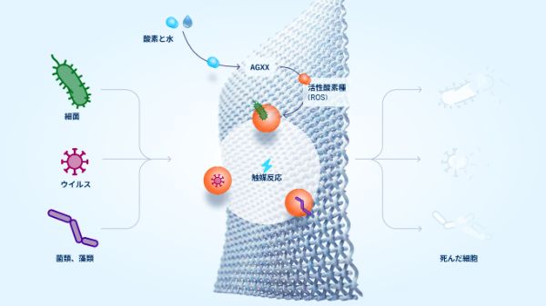 これを可能にしたのは、全く新しい作用機序です。AGXXは2種類の貴金属の相互作用を活用した非常に効果的な触媒技術であり、酸化還元反応と微小電界効果に基づいています。このプロセスでは、空気中の水分と結合した酸素が活性酸素種(ROS)の一種である酸素ラジカルに変換されます。これが微生物と反応し、微生物を確実に消滅させます。同時に、バイオフィルム(生物膜)の形成も防ぎます。